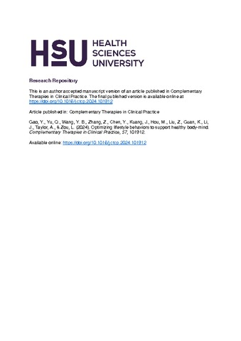 Gao, Yanping, Yu, Qian, Wang, Yu-Bu, Zhang, Zhihao, Chen, Yanxia, Kuang, Jin, Hou, Meijun, Liu, Zijun, Guan, Kaiqi, Li, Jinming, Taylor, Alyx and Zou, Liye (2024) Optimizing lifestyle behaviors to support healthy body-mind. Complementary Therapies in Clinical Practice, 57 (101912). ISSN 1744-3881