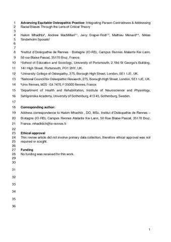Mhadhbi, H, MacMillan, A, Draper-Rodi, J, Ménard, M and Sinderholm Sposato, N (2025) Advancing Equitable Osteopathic Practice: Integrating Person-Centredness & Addressing Racial Biases Through the Lens of Critical Theory. International Journal of Osteopathic Medicine, 55. ISSN 1746-0689