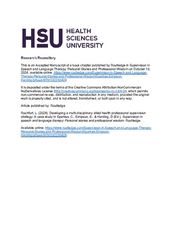 Rochfort, Lucie (2024) Developing a multi-disciplinary allied health professional supervision strategy: A case study. In: Supervision in speech and language therapy: Personal stories and professional wisdom. Routledge. ISBN 9781032293424