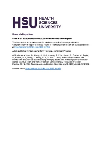 Yuan, Ding, Kuang, Jin, Li, Jinming, Cheung, Rebecca Y.M, Herold, Fabian, Gerber, Markus, Taylor, Alyx, Kramer, Arthur F, Wang, Jiahui, Yeung, Albert and Zou, Liye (2025) Relationship between trait mindfulness and physical activity among emerging adults: The mediating roles of exercise-related cognitive errors and trait self-control. Complementary Therapies in Clinical Practice, 59. ISSN 1744-3881